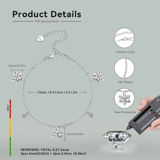 Adjustable Fashion Style S925 Silver Mossanite 2mm & 2.5mm Round Fine Flower Pendant VVS Moissanite Bracelet for Women Girls