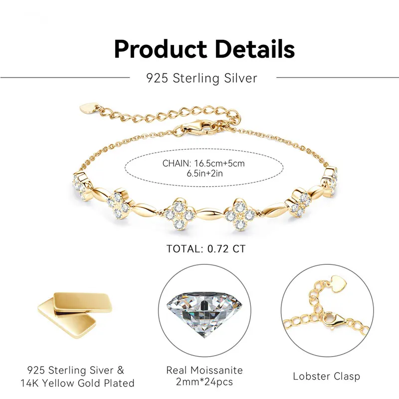 925 Sterling Silver Charm Flower Bracelet Summer Jewelry 14k Gold Plated 2mm All Moissanite Diamond Bracelet for Women