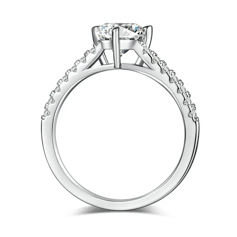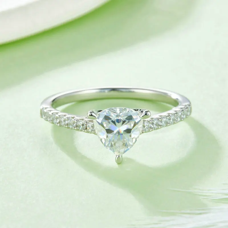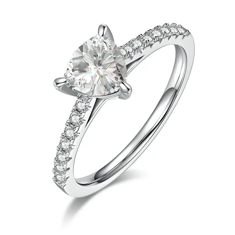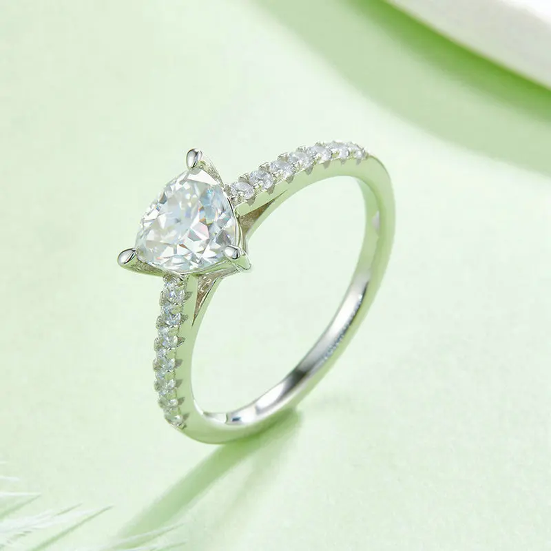 A striking sterling silver ring featuring a luminous trillion-cut moissanite. Its sharp, elegant facets create a distinctive sparkle, blending modern edge with timeless refinement. Light, radiant, and effortlessly sophisticated, it’s designed to stand out in both everyday wear and special moments.