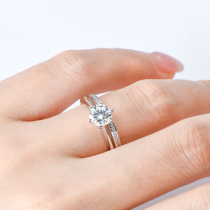925 Silver 6.5mm (1.0ct) Round Moissanite Bridal Ring Women's Classic Six Claw Wedding Band Set |