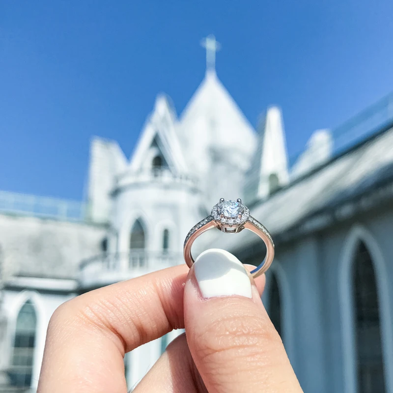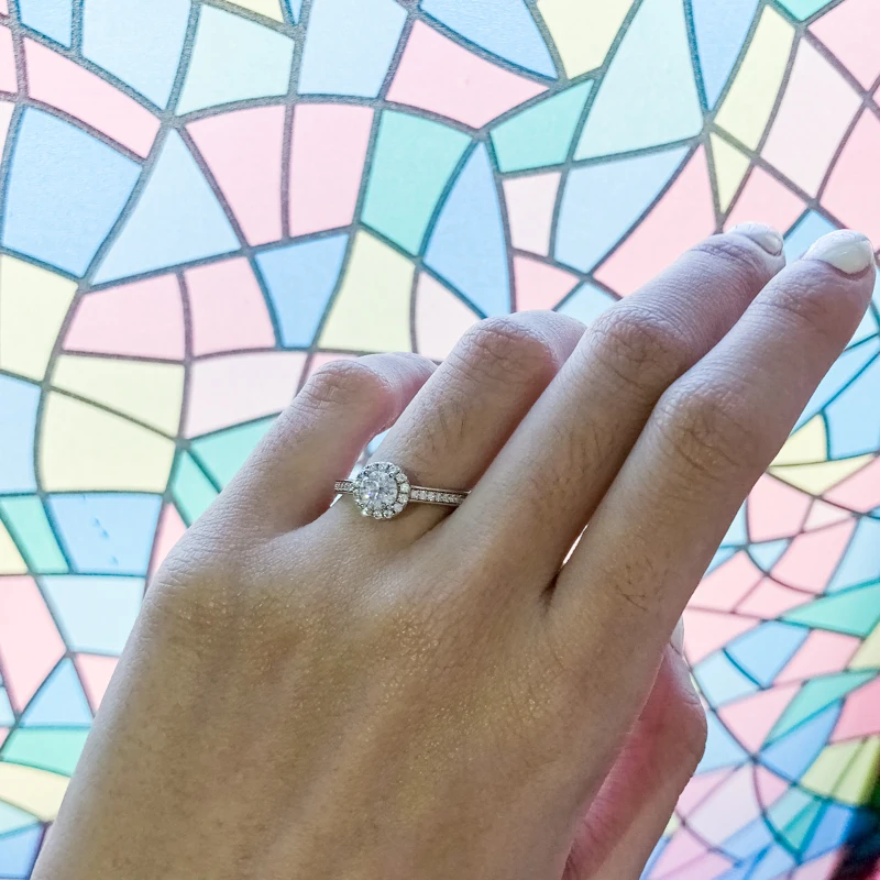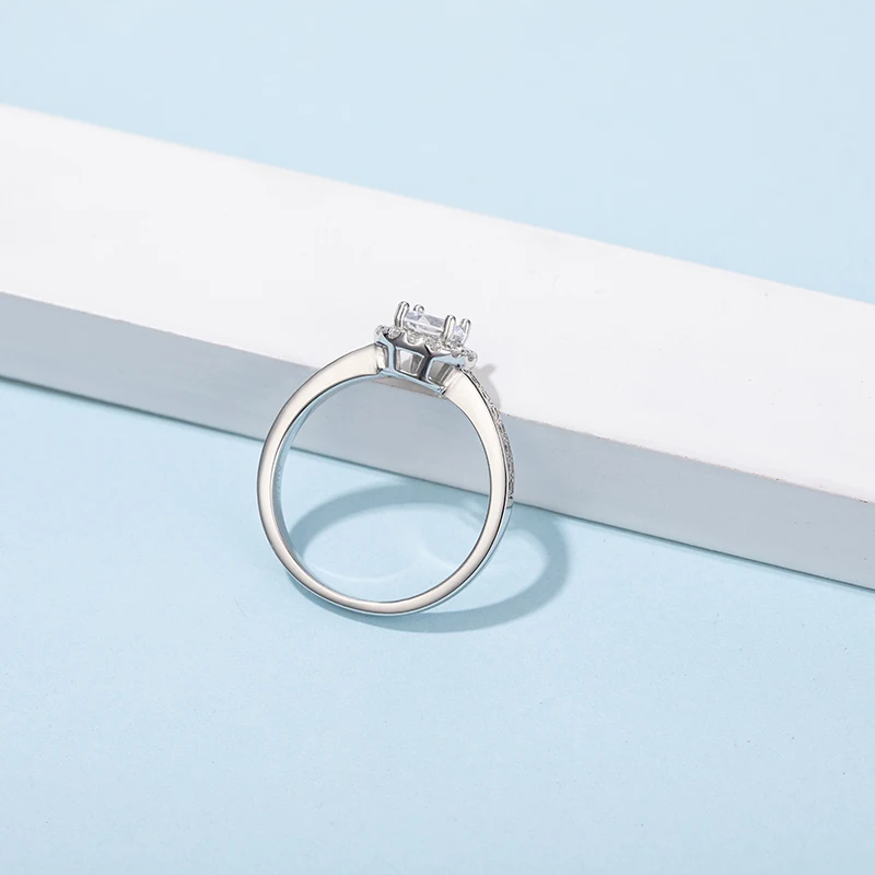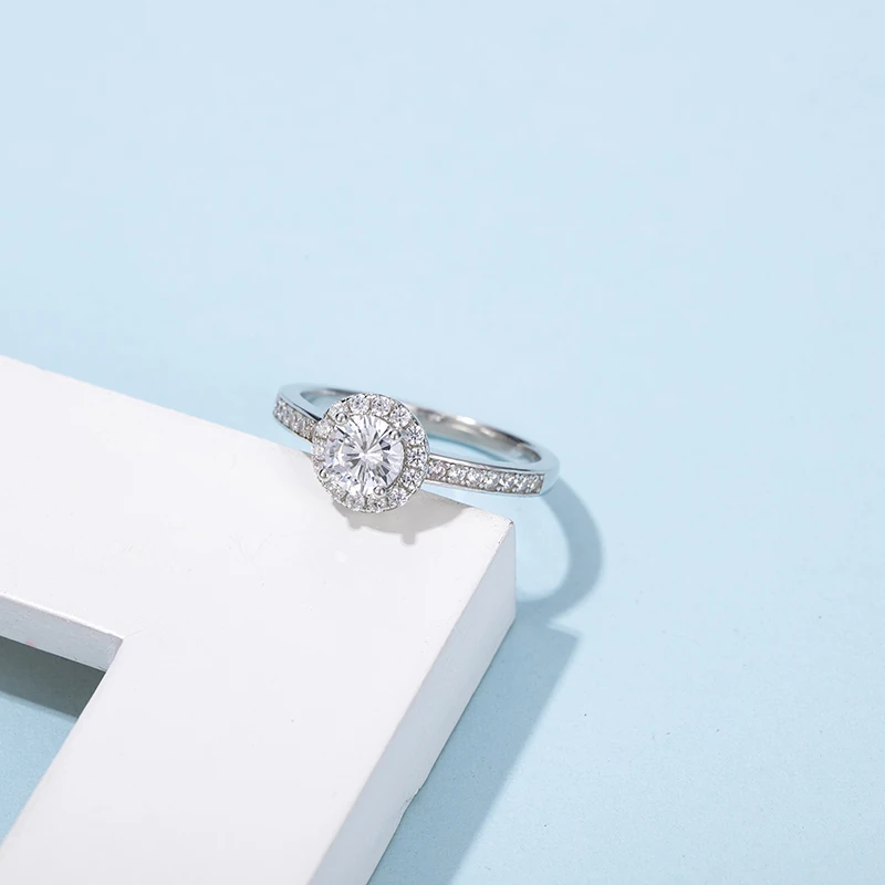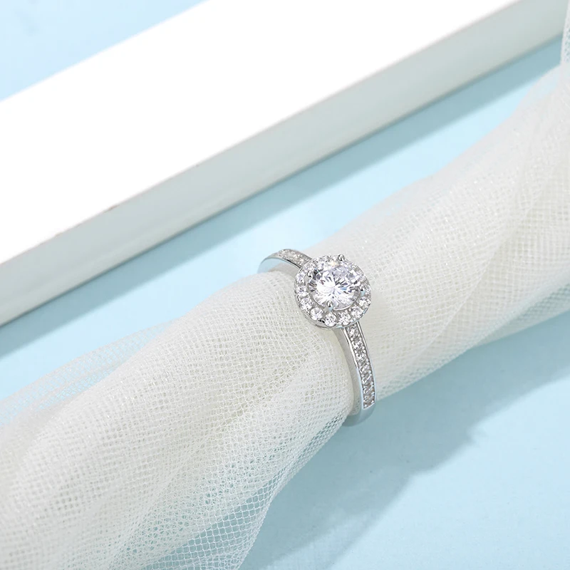 A delicate sterling silver ring featuring a brilliant round moissanite, encircled by a subtle halo of light. Its soft sparkle and refined design create a look that feels both graceful and timeless. Effortlessly elegant, it’s a piece made to shine in every moment.